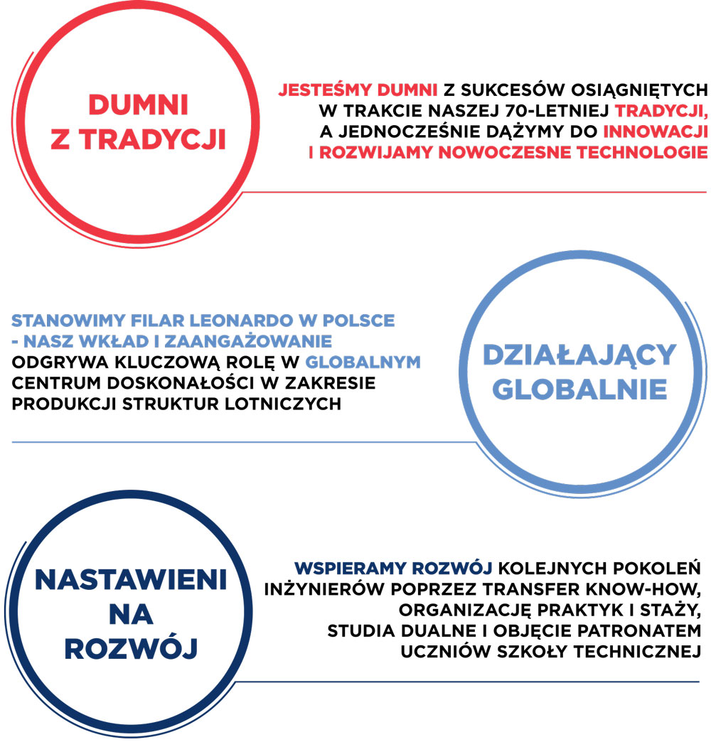Od 2010r. jesteśmy częścią międzynarodowego zespołu Leonardo – Grupy działającej w dziedzinach lotnictwa, kosmonautyki oraz obronności i bezpieczeństwa. Koncern zatrudnia ponad 49 tysięcy osób w zakładach produkcyjnych i biurach zlokalizowanych głównie we Włoszech, Wielkiej Brytanii, Stanach Zjednoczonych i Polsce.